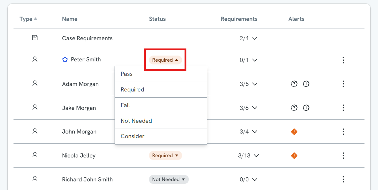 Change the status of the entity or individual to Pass, Fail, Not Needed, or Consider by clicking ‘Required’