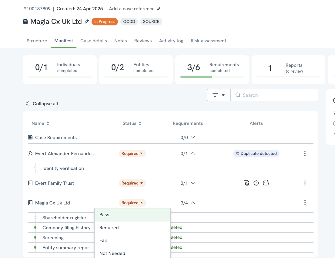 Once all individuals and entities are marked as PASS in the new case, the alert will be removed and the CDD cadence will reset. If any party is marked as FAIL, the alert will be removed and they will no longer appear in future CDD alerts.