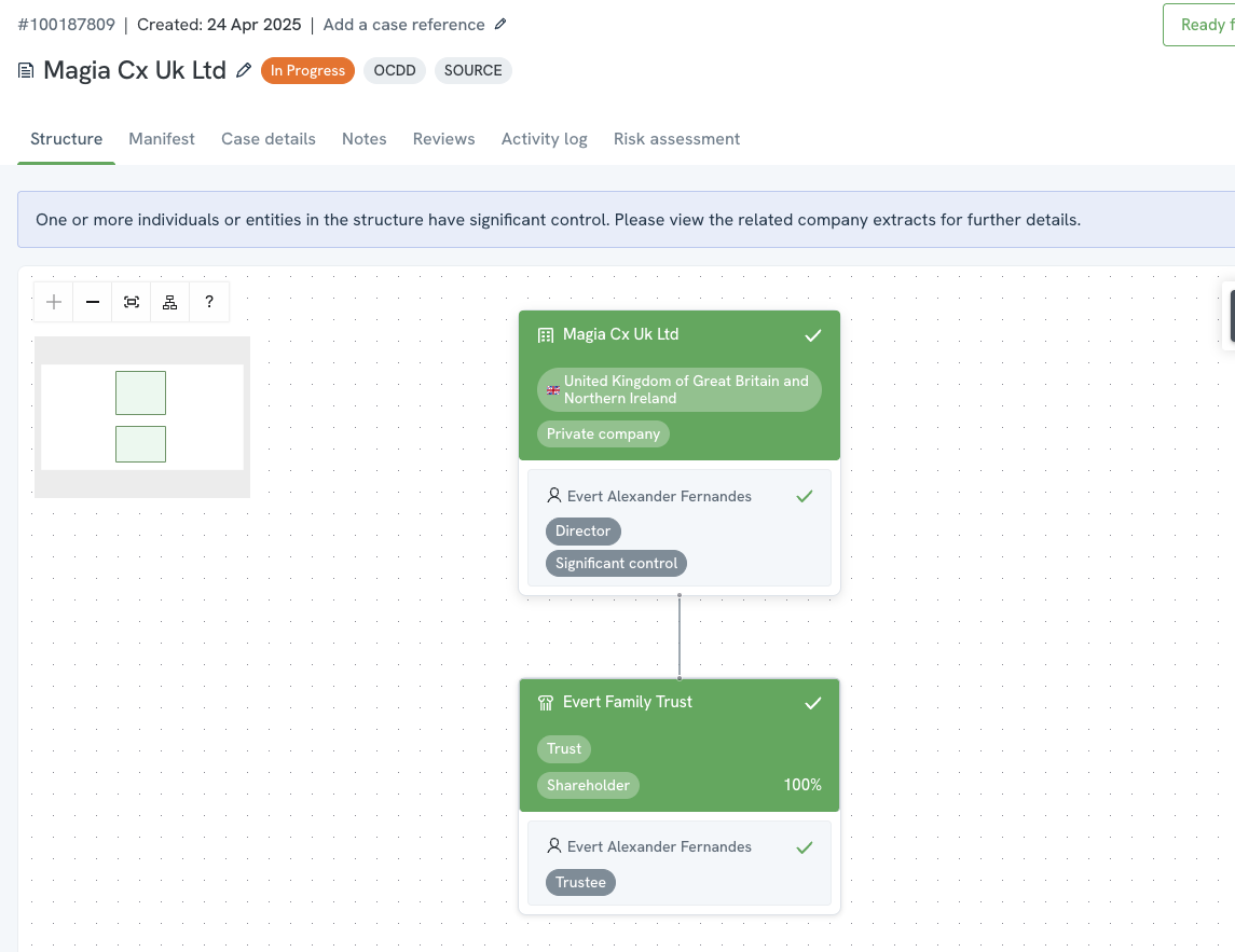 For example, in a case where you have verified a Company (your direct client) with a Trust as a shareholder, you will see one singular alert for the Company. There will not be any additional alerts for individuals or other entities.