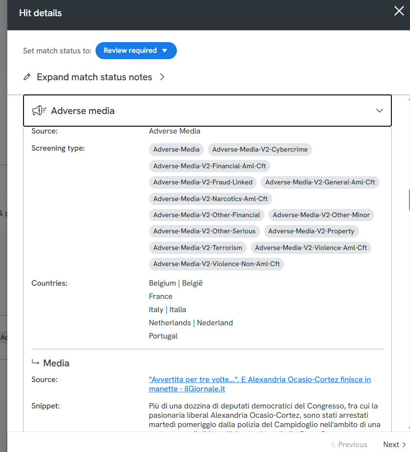 This will have links to the adverse media published about the entity. You have a link to the article and also a snippet of that article to see if it is of interest to you.