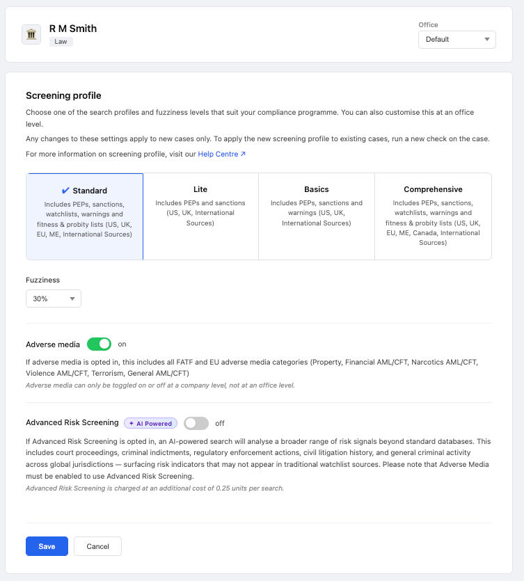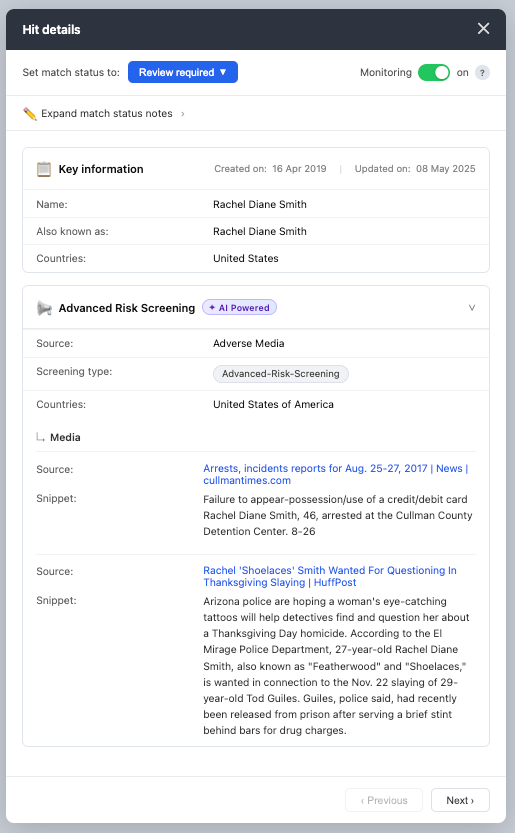 Advanced Risk Screening runs alongside your existing Adverse Media search to catch things that standard screening can miss.