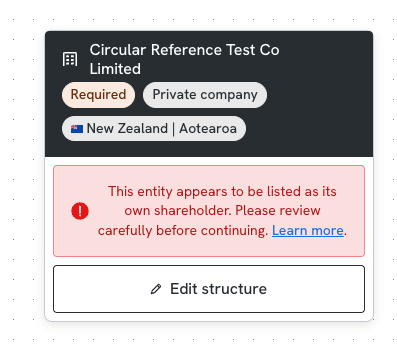 There is an error message that states - 'This entity appears to be listed as its own shareholder'
