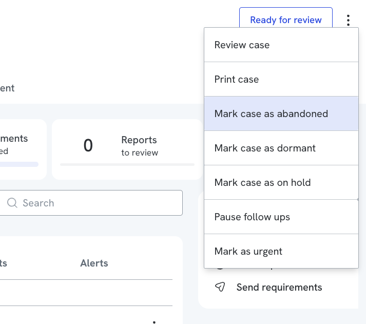 Once the "More options" menu is open, click "Abandon case" and the case will change to 'Abandoned' status and no longer appear on your Homepage.