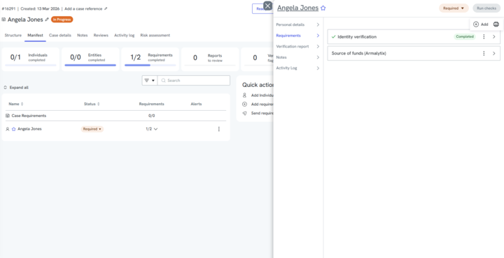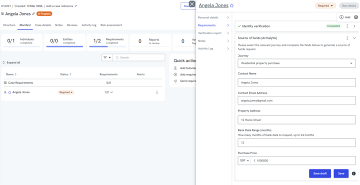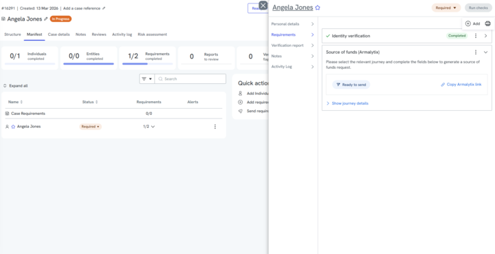 - Click 'Add requirement' underneath the individual or entity you want an Armalytix request to be sent to. Select 'Source of funds (Armalytix)
