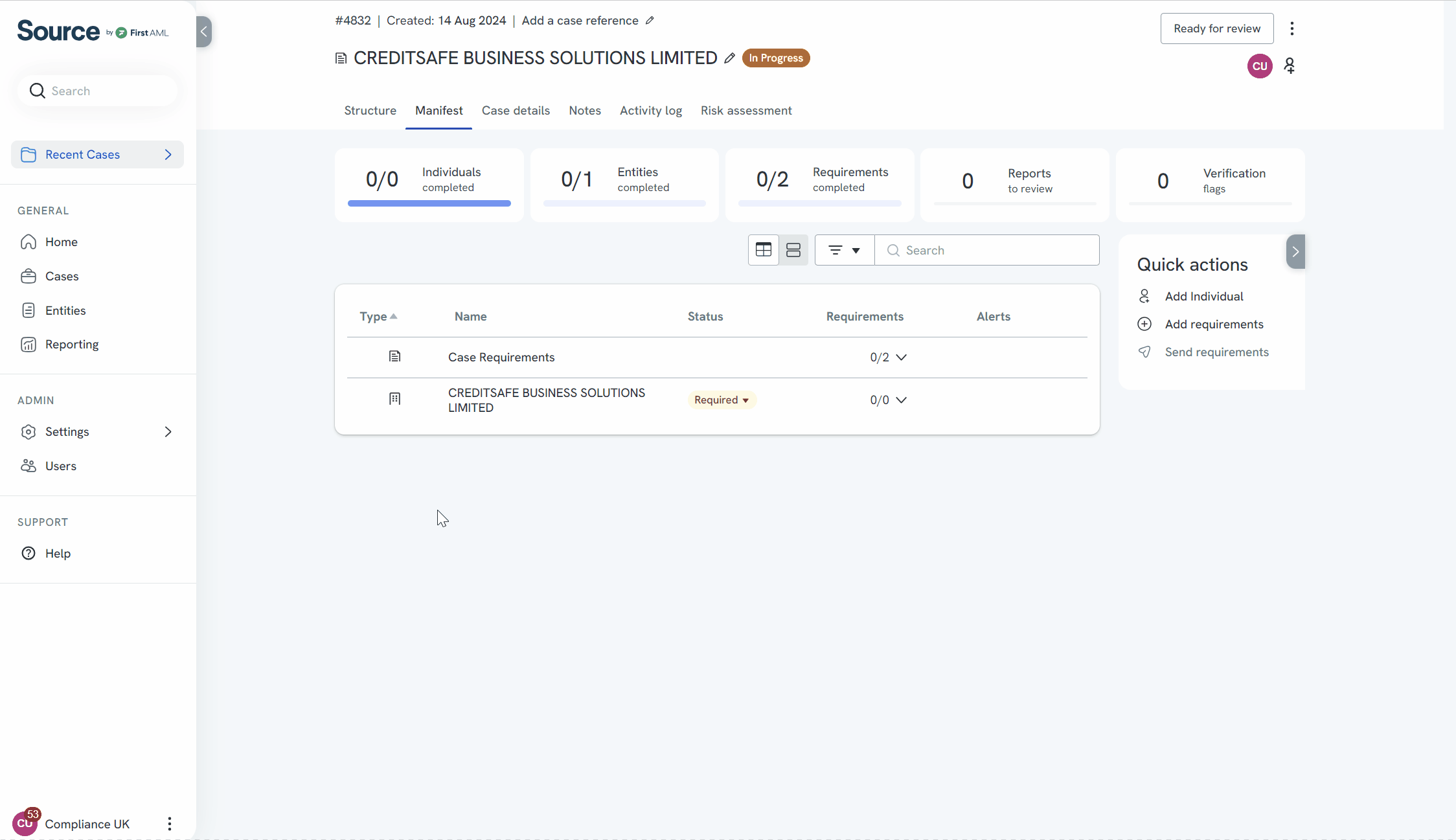 - Create an entity case for a private company in the platform. Refer to our entity case creation article for step-by-step instructions.