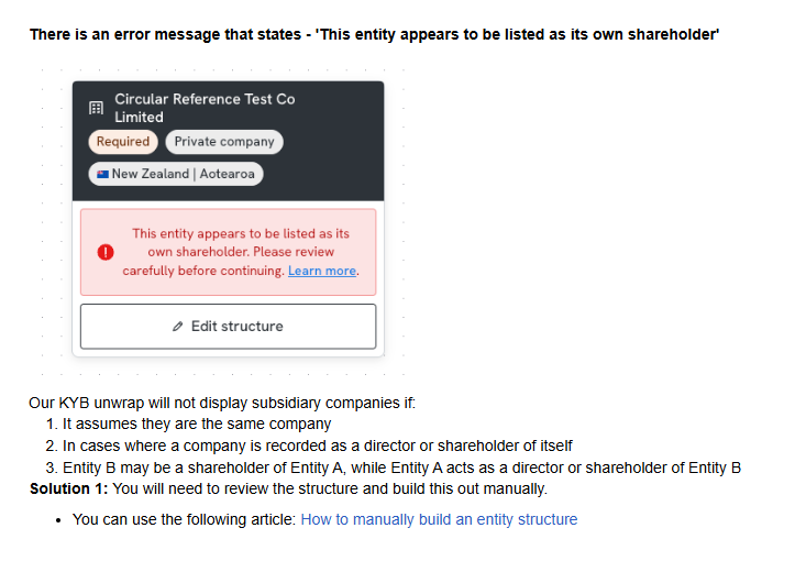 Please also refer to this help centre article for more tips on how to troubleshoot entity verification errors or this article for further information on unwrapping companies