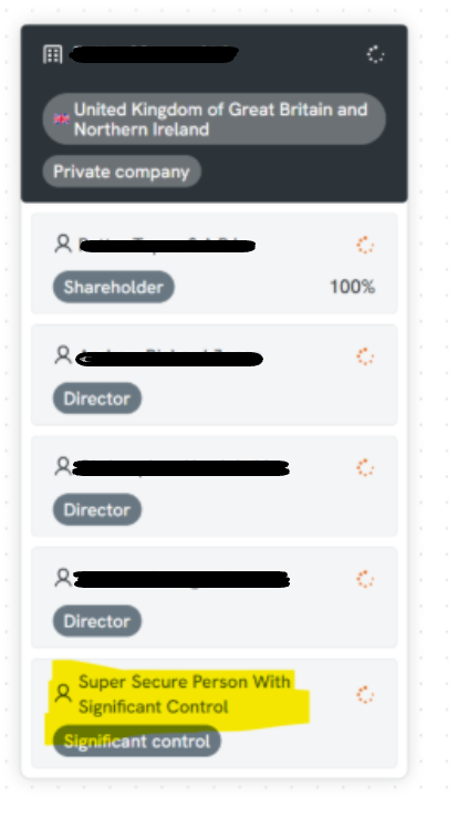 This tag means that PSC details are "super-secure", which is a special category in Companies House. UK law allows certain PSCs to be "super-secure", meaning their personal details are protected and not publicly disclosed for privacy or safety reasons (e.g., law enforcement, witness protection).