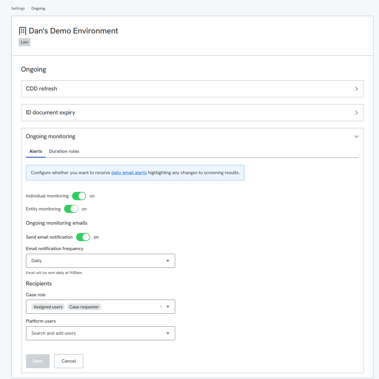Email notifications will be sent to your designated recipients (case lead, assigned users, case requester or a specific platform user) if there are any new matches, updates to existing hits, or removals of hits, these notifications can be set to daily or weekly.