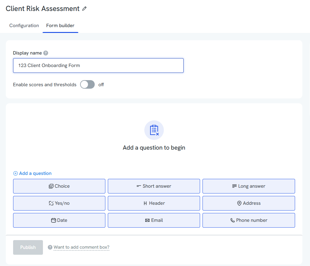 In the Form Builder, add a Display name which will be visible to clients if you are sending the form externally. This is also what the Requirement will be called and what platform users will see within the case.