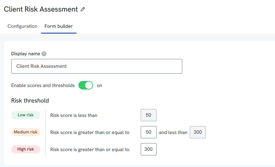 When a risk assessment is completed, the cumulative score of all answers is presented and the client/matter is categorised as either Low, Medium, or High risk depending on where the score falls within the score parameters set by you.