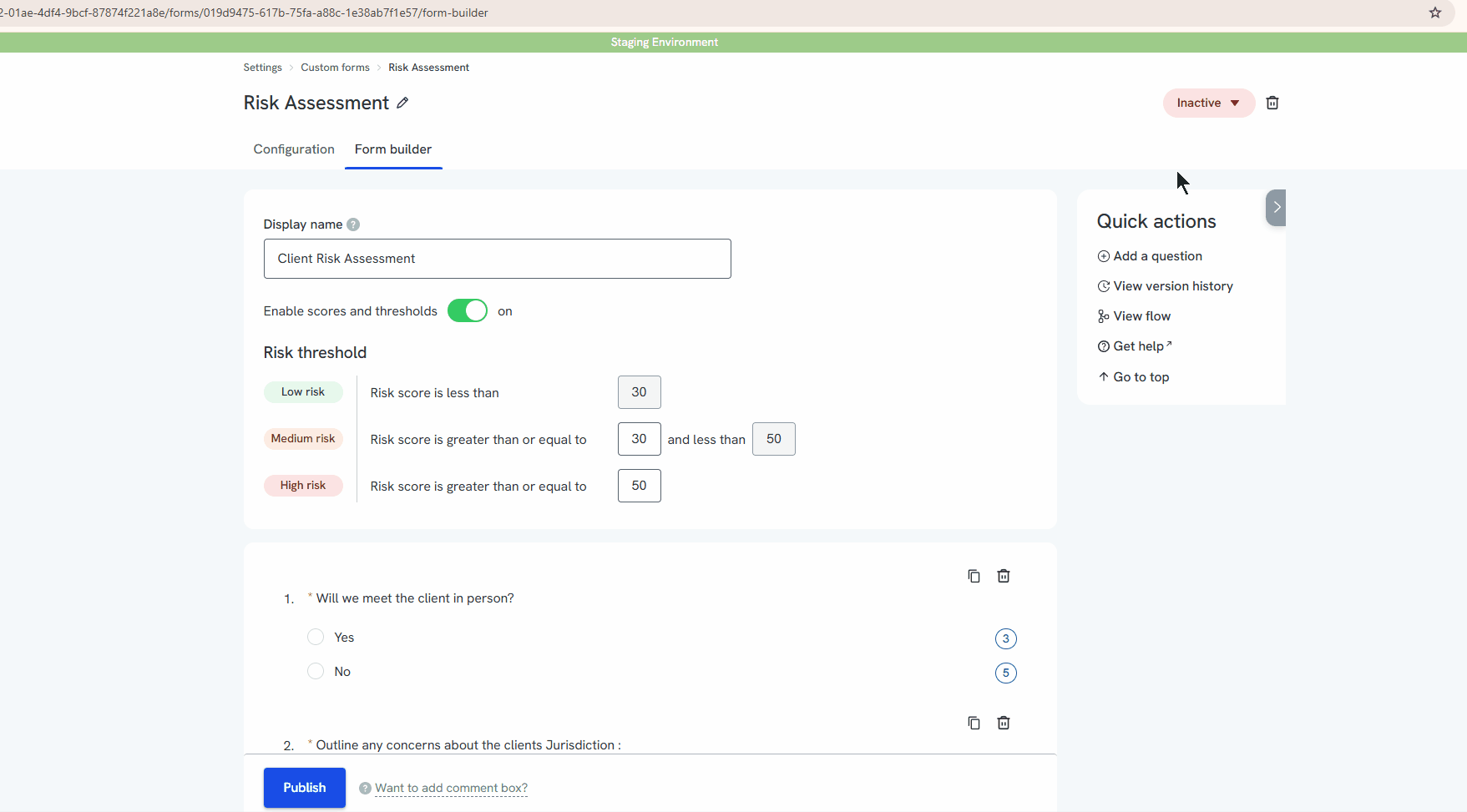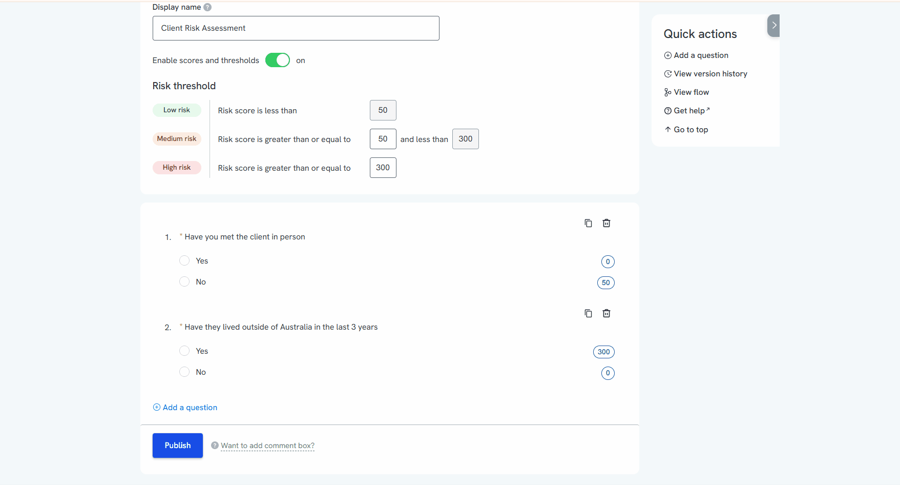 Risk weighting allows you to automatically calculate the overall risk score of a client or matter. The form builder enables you to add "weighting" to each answer, with lower scores for answers that represent lower risk, and higher scores for red flags. For example, answering “Yes” to “Will we meet the client in person?” might have a score of 0 (low risk), while “No” might have a score of 3 (higher risk).