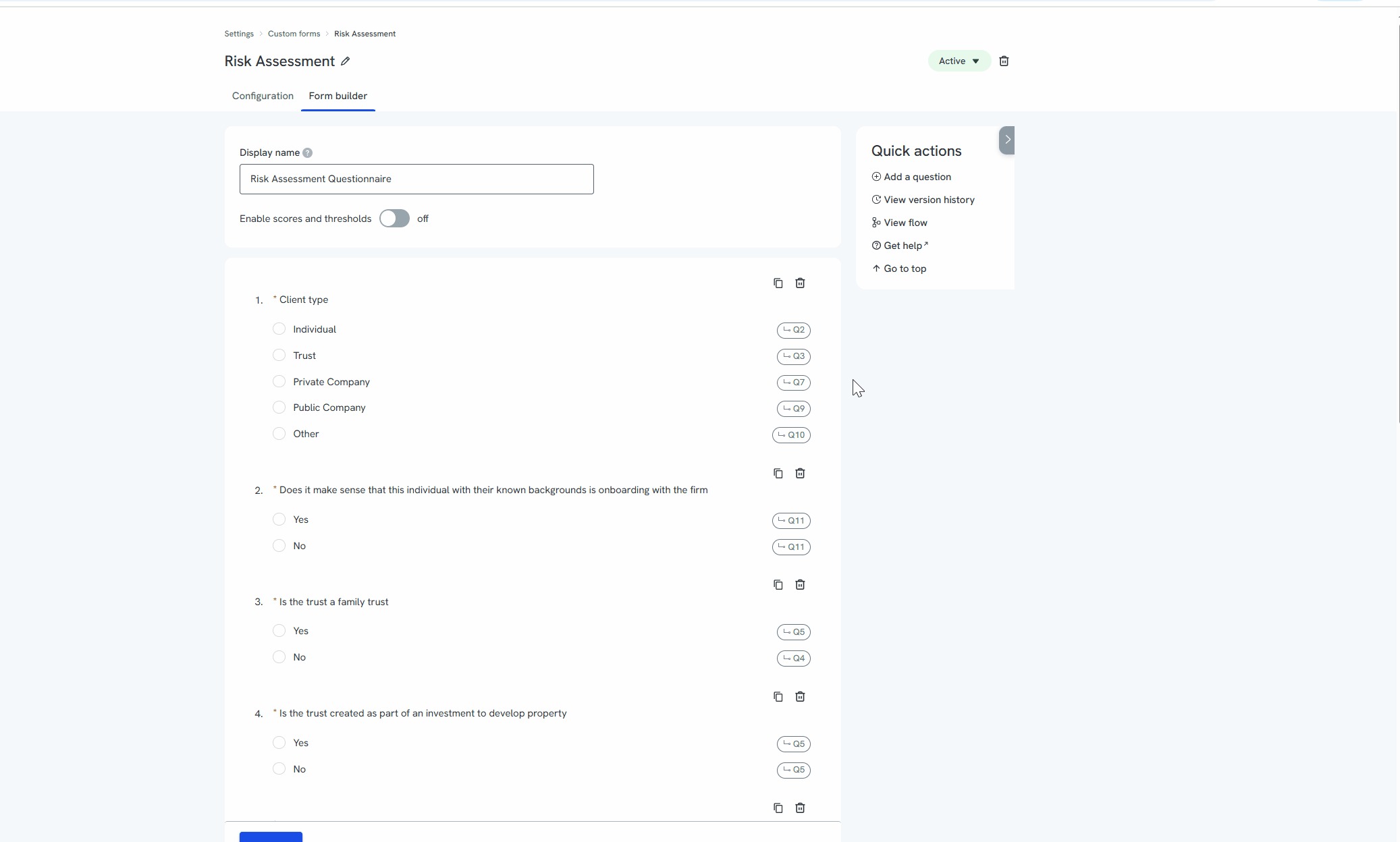 This helps you visualise how your form progresses, especially when using dynamic questions, to ensure each path flows correctly and reconnects to the main questions for all clients.