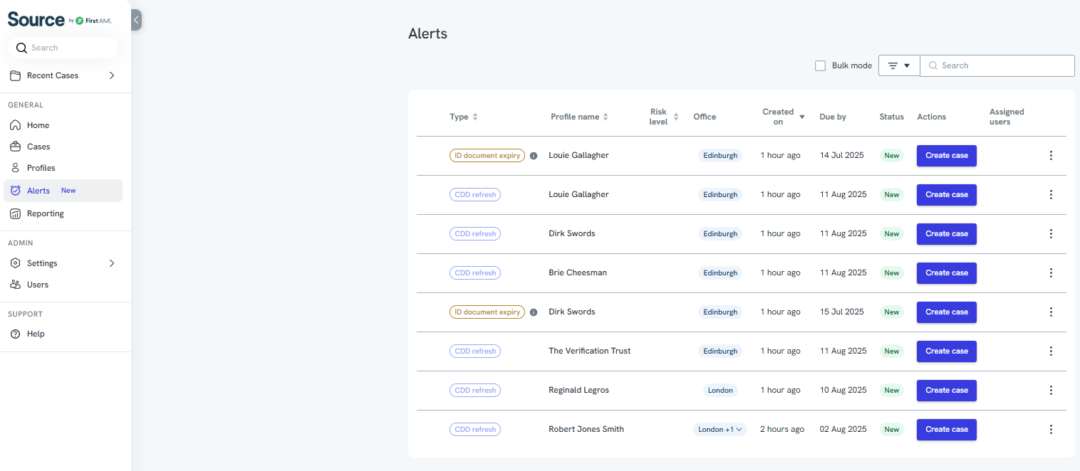 The alerts dashboard is your central location for managing key compliance alerts in the platform. It helps ensure you never miss an alert - such as re-verifying a client due to an expired ID or an upcoming CDD refresh.