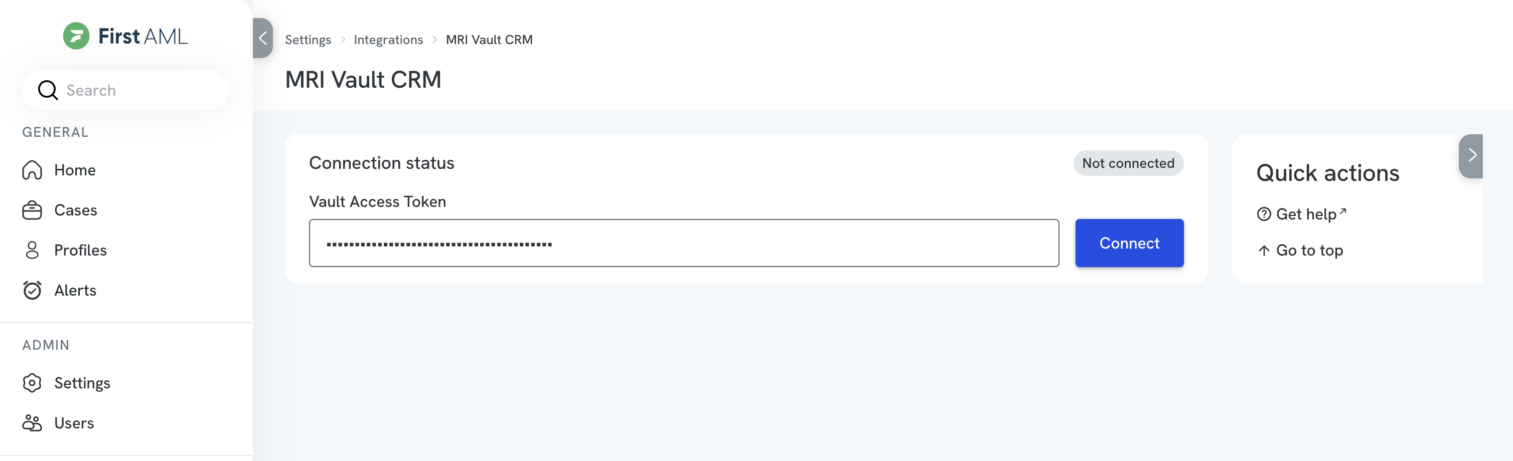- As a Compliance Admin in First AML, select “Settings” in the left-side menu, then go to “Integrations” > “Vault” > Connect.