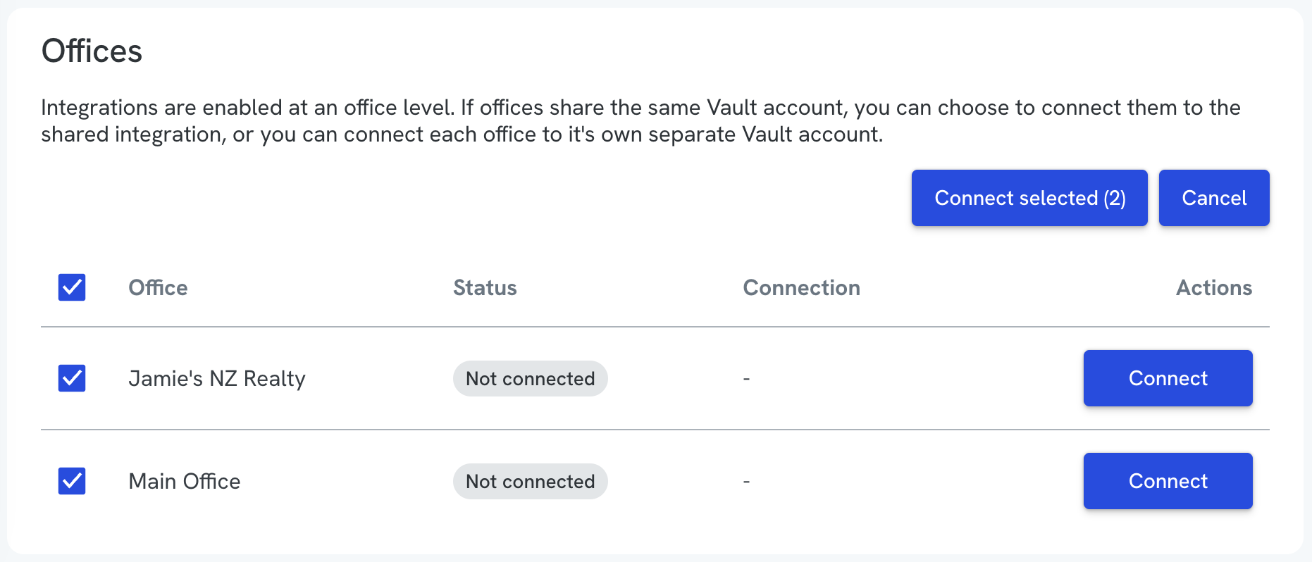 - In the “Offices” section, select “Connect” for the office you want to integrate with this Vault account.