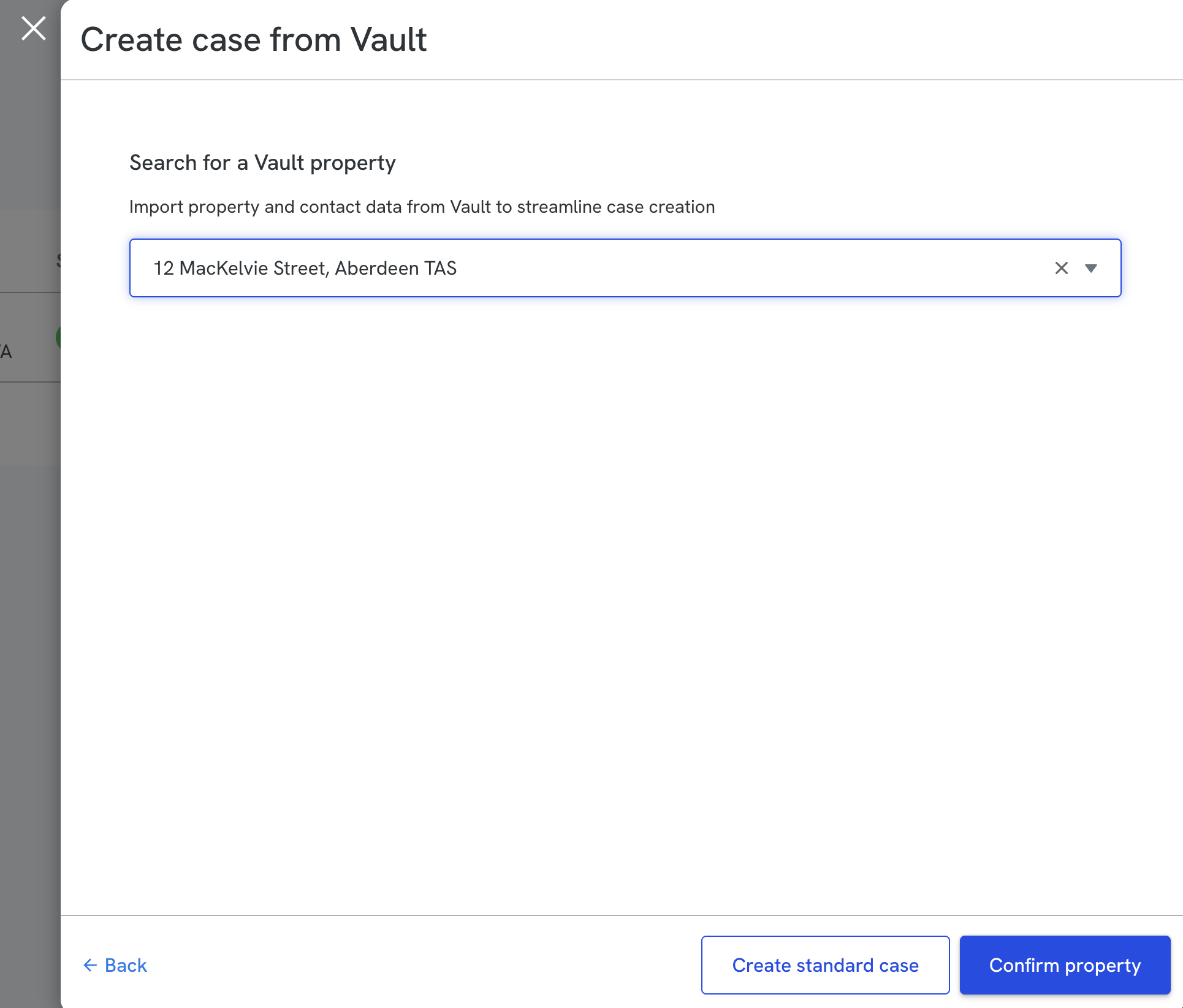 - Search for and select the Vault property, then select “Confirm property”. The selected property address and any associated sellers and buyers will be pulled in from Vault.