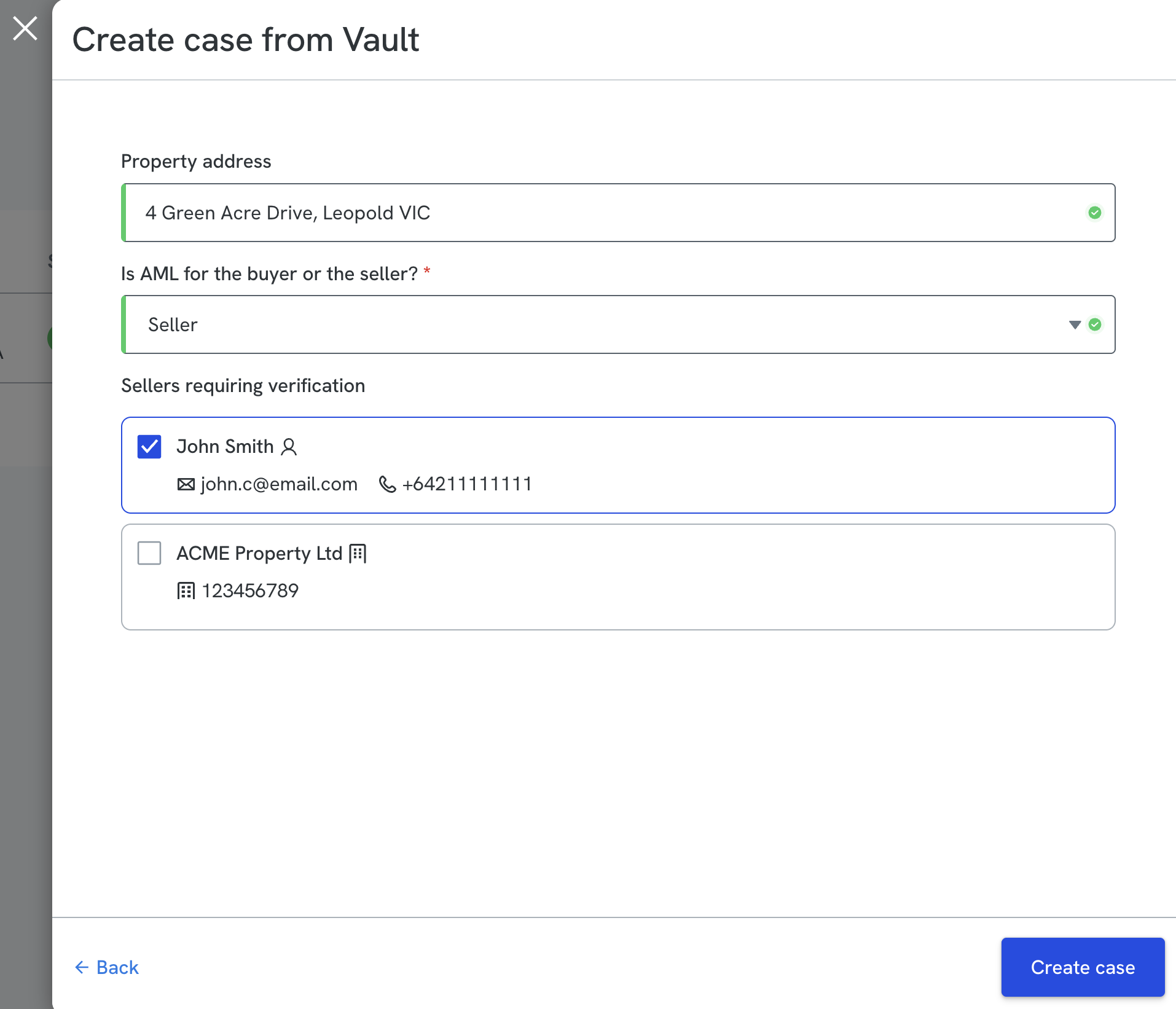 d. If both sellers and buyers are associated with the property, confirm whether the case relates to the seller or buyer, then select the Vault contacts that require verification.